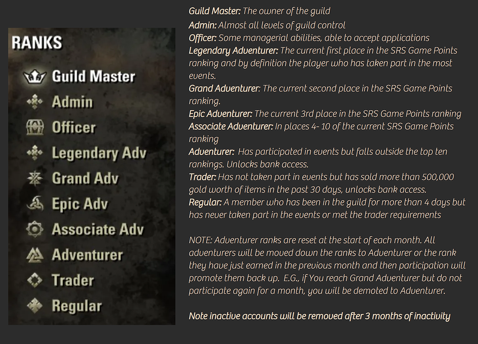 The New Recruit rank has been removed. Instead everyone will be regulars. There is no change to permissions. A new rank of Trader has been added. This allows Guild Bank access and reading member notes. To qualify you need to sell 500K or more in the last 30 days. This is great for those who are not interested in events but take an active role in trading. Adventurers and above already have bank access, so traders and adventurers have the same privileges.